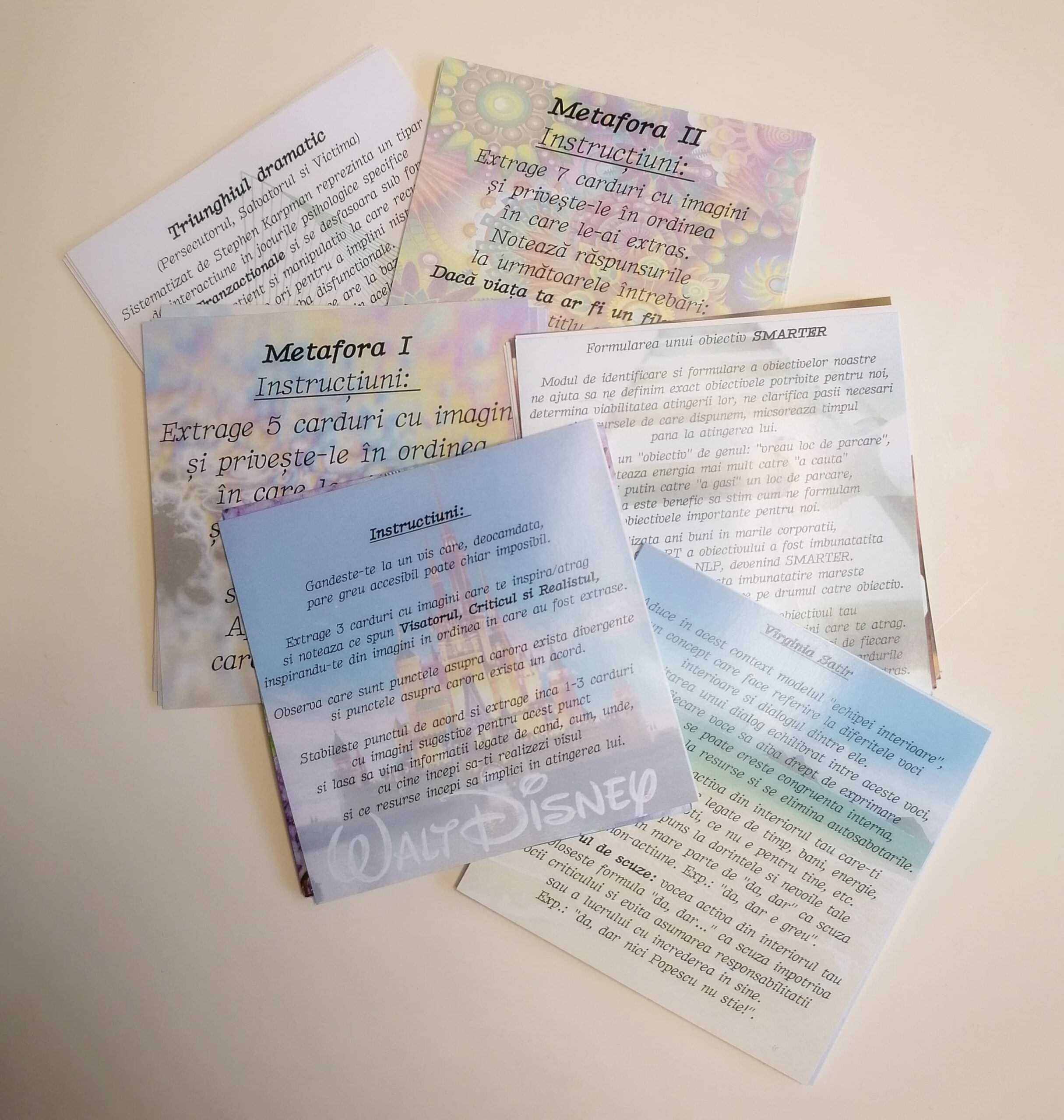 👉 Carduri detaliind 5 dintre cele mai eficiente tehnici NLP: Strategia Walt Disney, Metafora, Triunghiul dramatic, Obiective SMARTER, Echipa Interioară (Virginia Satir).